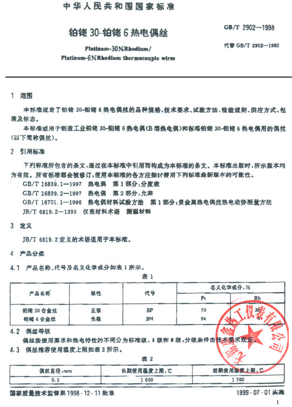 B分度號 鉑銠30-鉑銠6熱電偶標準